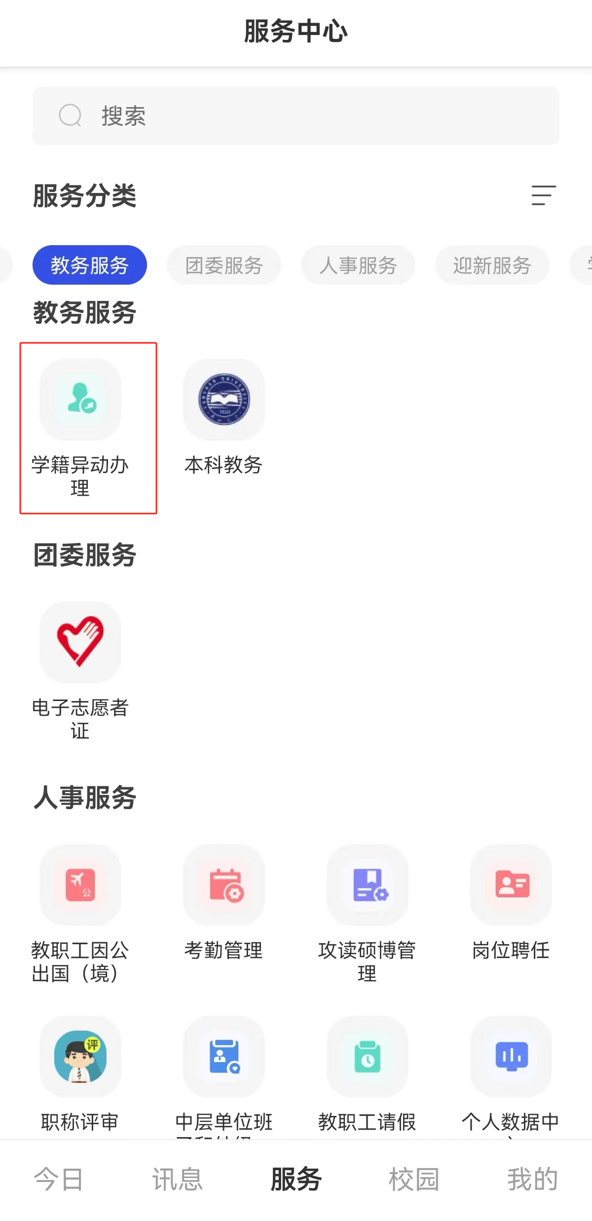 3.今日校园APP:打开服务页面,搜索“学籍异动办理”。
