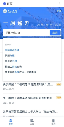 1.电脑端:使用统一身份认证账号登录一网通办,搜索“学籍异动办理”。