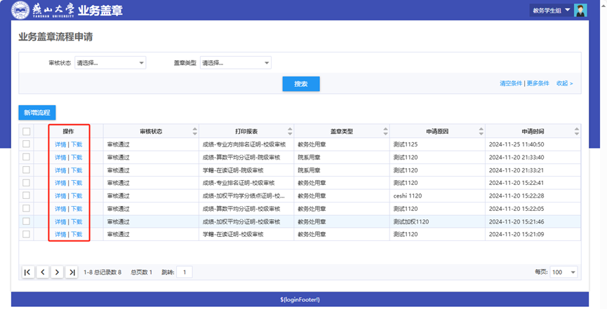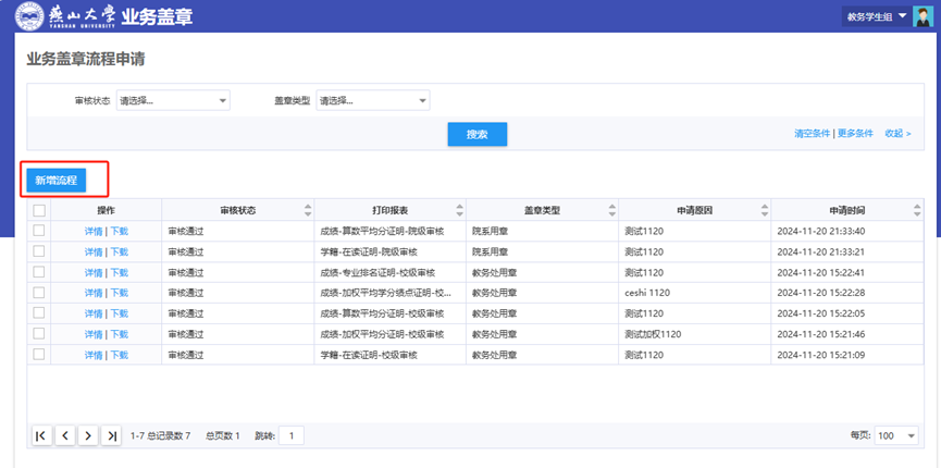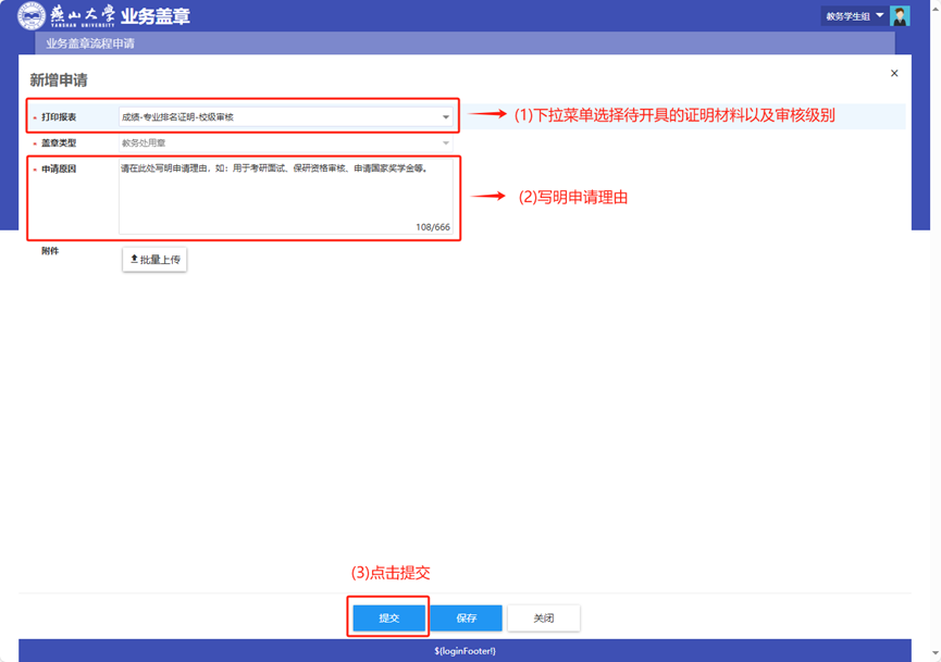 点击“新增流程”,在“打印报表”下拉菜单中选择需要申请的证明,填写申请原因后,点击“提交”按钮。