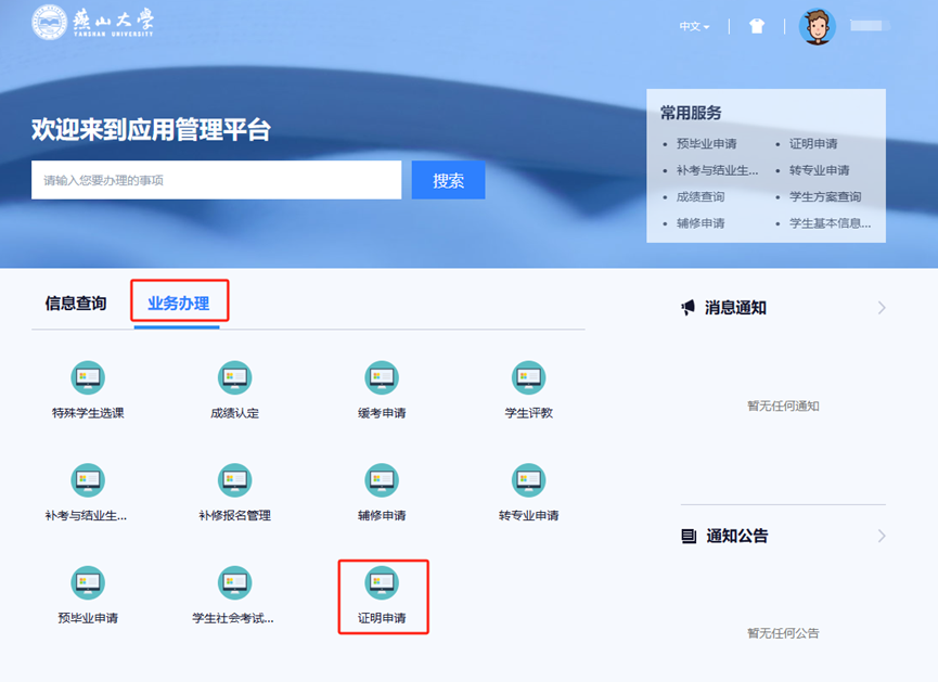 学生在PC端或移动端,使用浏览器输入乌鸦传媒教务处网址(http://jwc.cs-ch.com),点击“本科教务系统”,登录个人账户后,在“业务办理”页面下,进入“证明申请”应用。
