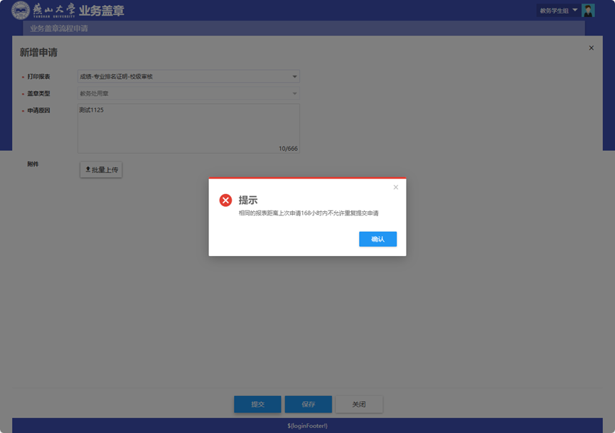 2、同一审核级别的同一种证明材料,每7日可以申请一次,否则系统将提示“不允许重复提交申请”,请学生做好申请规划。