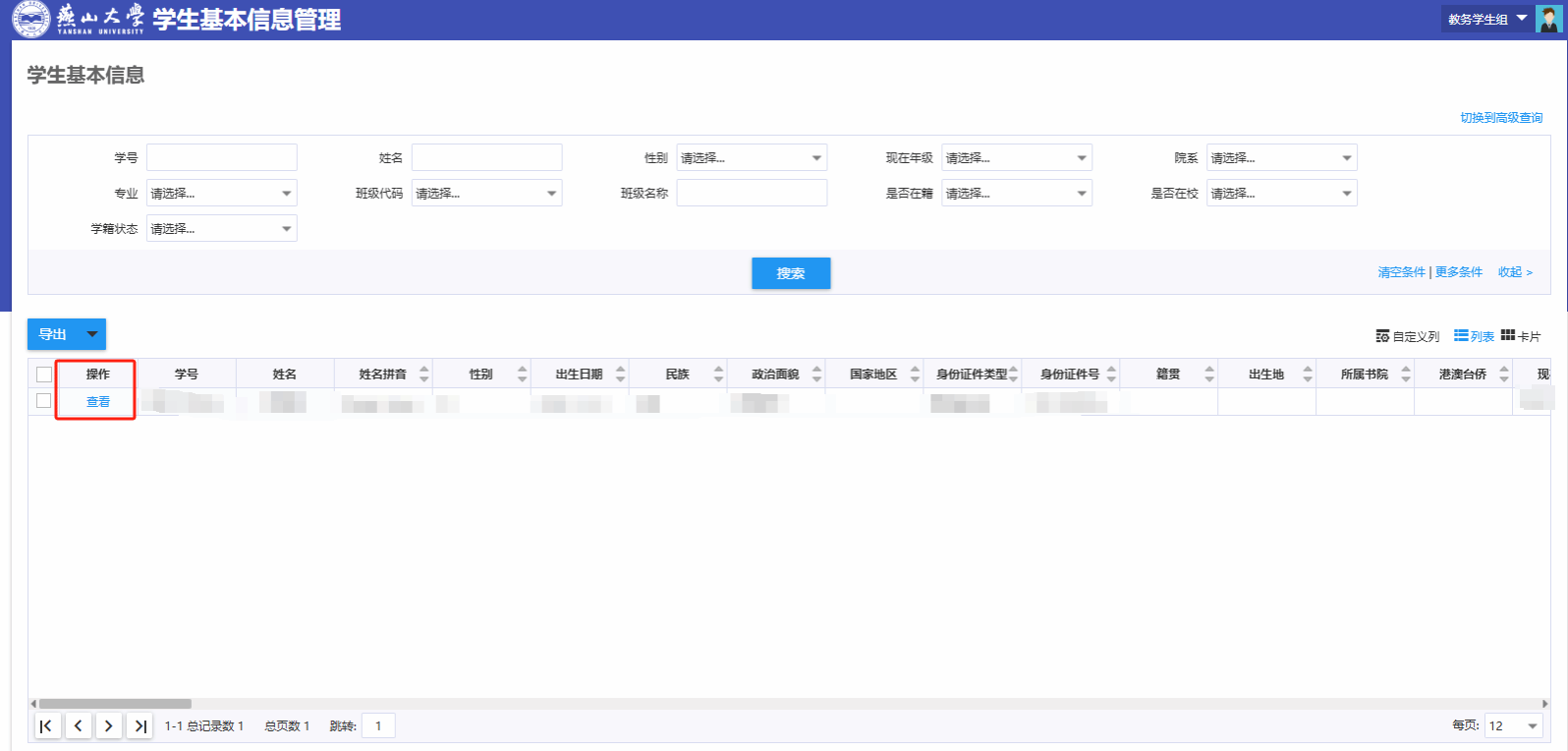 点击“学生基本信息管理-查看”,可以查看学生本人的学籍信息。