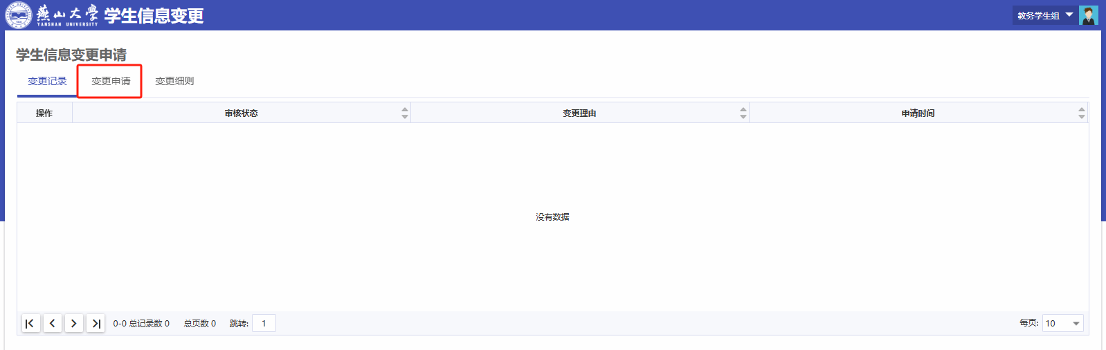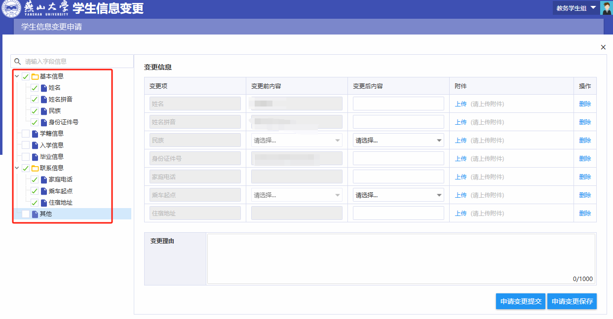 点击“学生信息变更-变更申请-申请变更”,可以申请变更姓名、姓名拼音、民族、身份证件号等信息。