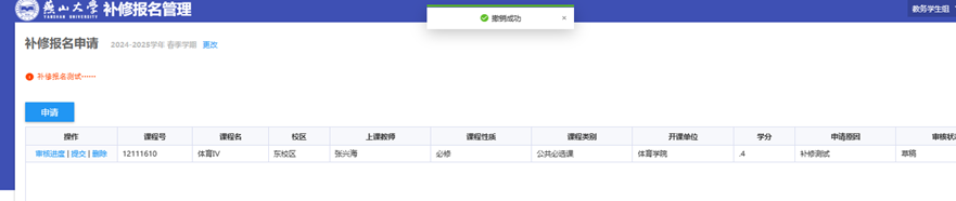 审核不通过的补修课程,将退回到学生申请页面。学生可以点击【删除】或【提交】按钮进行相应的操作。