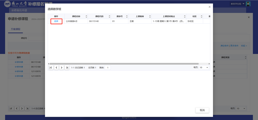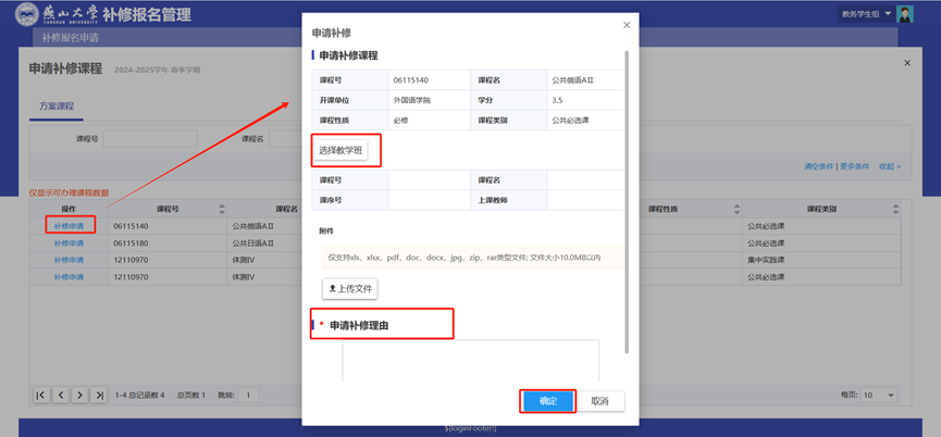 (3)进入补修详情页面,仔细核对课程信息是否正确。确认无误后,点击【选择教学班】按钮,在弹窗中仔细查看上课时间、上课地点、校区等教学班信息,选择拟加入的教学班并填写补修理由,点击【确定】按钮,完成补修报名。