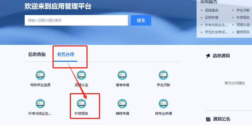 学生在PC端或移动端,使用浏览器输入乌鸦传媒教务处网址(http://jwc.cs-ch.com),点击“本科教务系统”,登录个人账户后,在“业务办理”页面下,进入“补修报名”应用。