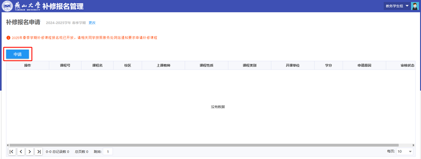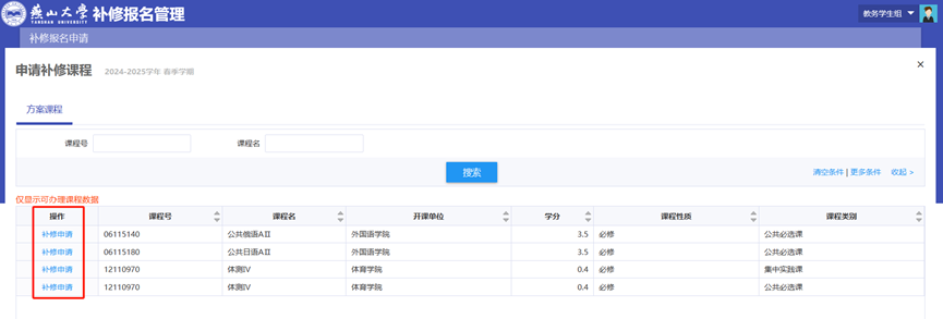 若申请页面中未显示所需补修的课程,请联系学院教务老师和教务处,确认原因。