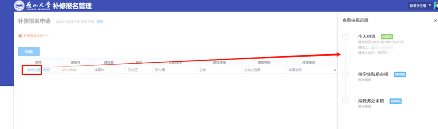 补修申请提交后,需等待学院教务老师和教务处逐级审核。点击【审核进度】按钮可以查看审核进度,点击【撤销】按钮可以撤回申请流程。