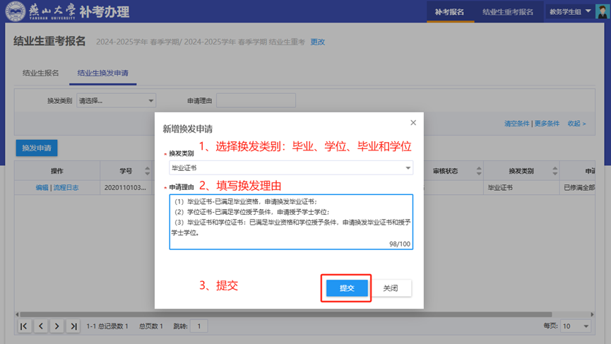 在换发申请对话框,根据结业生个人实际情况,选择换发类别(毕业证书、学位证书、毕业证书和学位证书),填写申请理由后,点击提交按钮,发起换发申请流程。