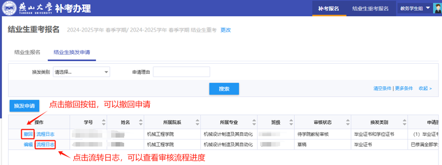 换发申请提交后,结业生应主动联系原所在学院教务老师,提醒老师为其进行毕业学位资格审核;审核结论可通过“结业生换发申请”页面的“流转日志”、“审核状态”查询;如提交换发类别有误,可点击“撤回”按钮撤回、修改换发申请。