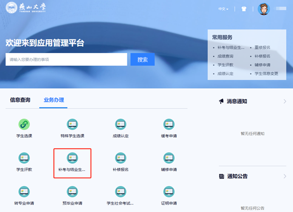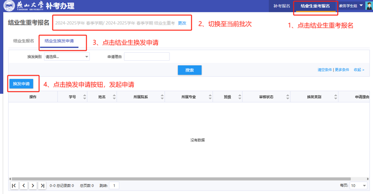 在“业务办理”页面下,点击“补考与结业生考试办理---结业生重考报名-----切换学年学期至当前学期----结业生换发申请”。
