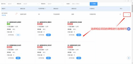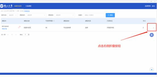 注意:如果是选择“拓展外语”,则需要点击右侧折叠按钮将具体的项目展示出来之后才可进行选课。例图如下