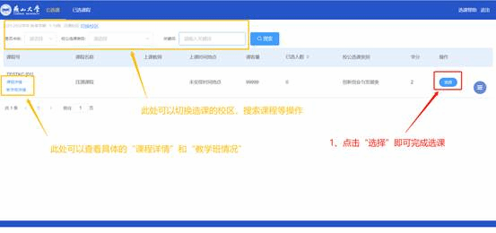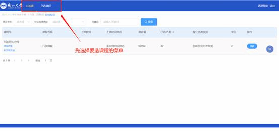 进入选课页面之后,选择开放选课的课程菜单,可以看到所有可以选择的课程(不符合选择条件的课程不会显示),点击相应课程右侧的“选择”即可完成选课。