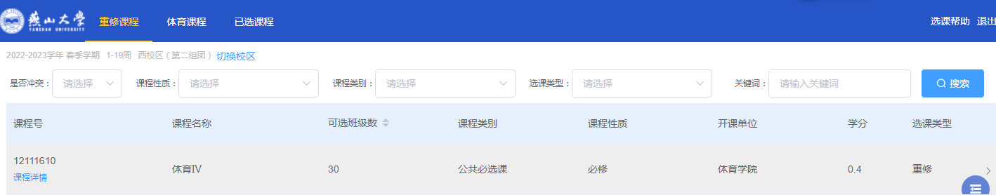 若是选择以前已有成绩且不及格课程,请在“重修课程”下进行操作。如下图所示: