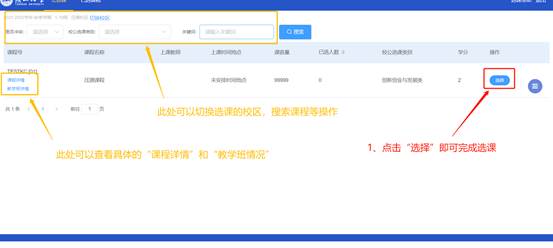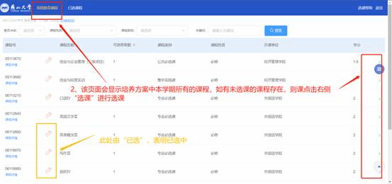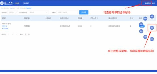 在选课时,可点击右上角的“选课帮助”查看简单的选课指引,也可点击右侧悬浮框,使用一些基础功能。