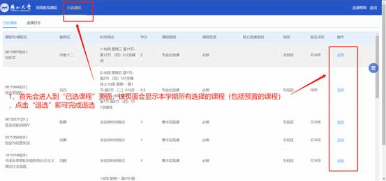 进入选课页面之后,可以看到所有已选课程(必修课和已选的选修课),该页面可对本学期预置的必修课进行退课。